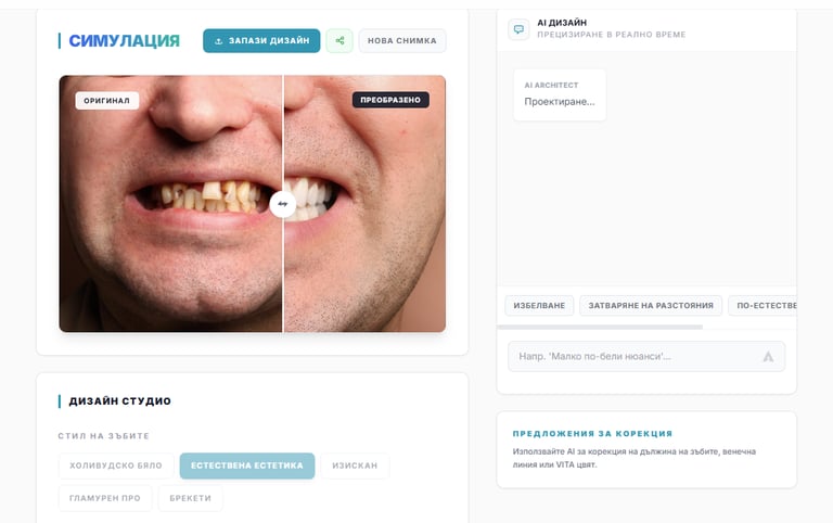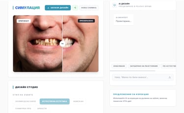 Плъзнете сравняващия слайдер и разгледайте разликата между оригинал и дизайн. Запазете резултата и го споделете със своя стоматолог, за да превърнете визуализацията в реалност.