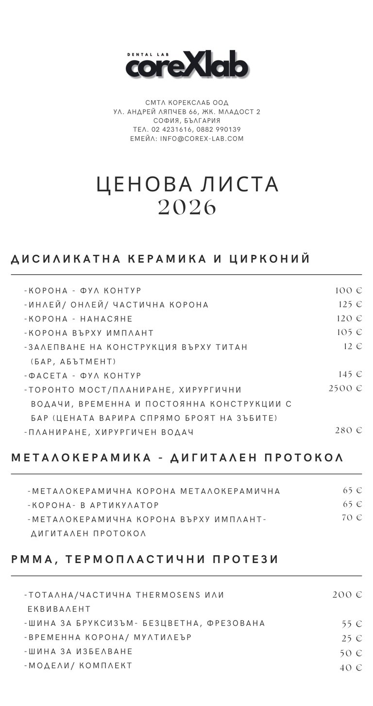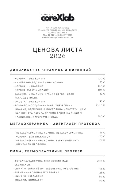 Ценовата листа на CoreXLab е с информационен характер и не представлява публична оферта по смисъла на чл. 13 от Закона за защита на потребителите. Цените на всички изделия, включват артикулиране, фрезоване, 3д дизайн и транспорт. Индивидуален абътмент, лабораторен аналог, могат да бъдат поръчани, от лабораторията и се калкулират допълнително. Всички цени са в евро (EUR). Цените подлежат на промяна с предварително уведомление, като при заявена поръчка се прилагат актуалните към момента на заявката. При специфични случаи или индивидуални конструкции е възможно персонализирано ценообразуване. CoreXLab си запазва правото да актуализира условията и цените по всяко време.